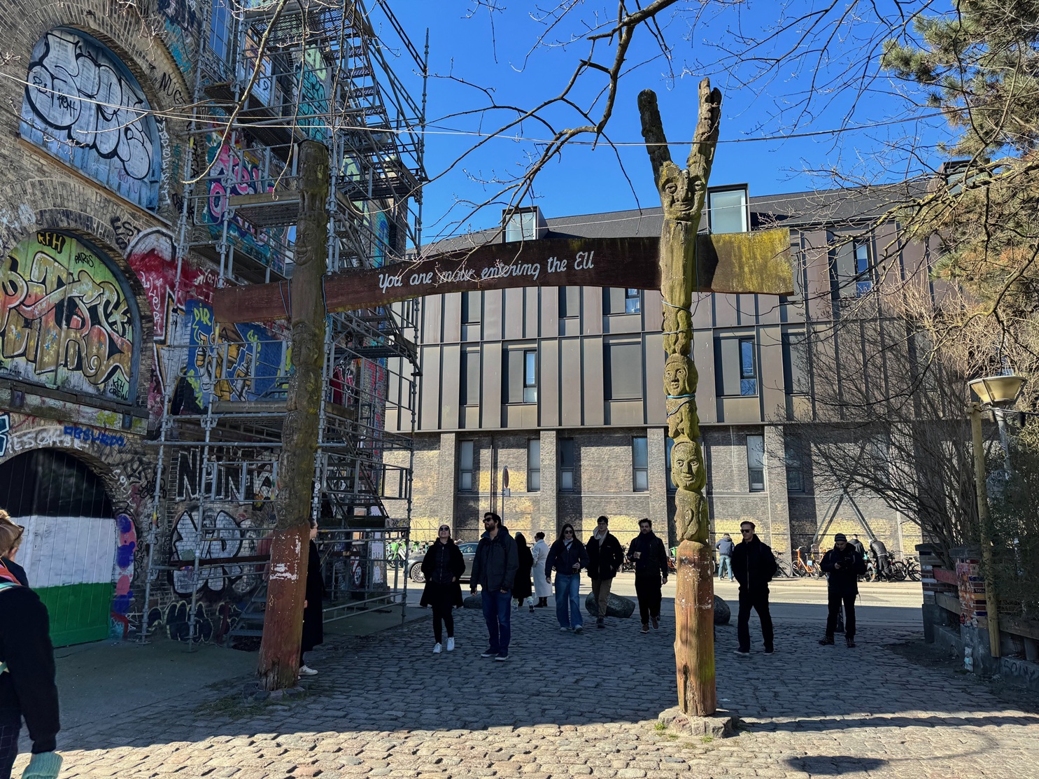 L’entrée principale de Christiania se fait par un portail emblématique. Une inscription, côté entrée : « Christiania ». Et côté sortie : « You are now entering the EU ». Le ton est donné ! Passé ce seuil, on découvre un monde un peu à part, où les murs se couvrent de fresques colorées, de messages politiques, et de symboles contre-culturels…