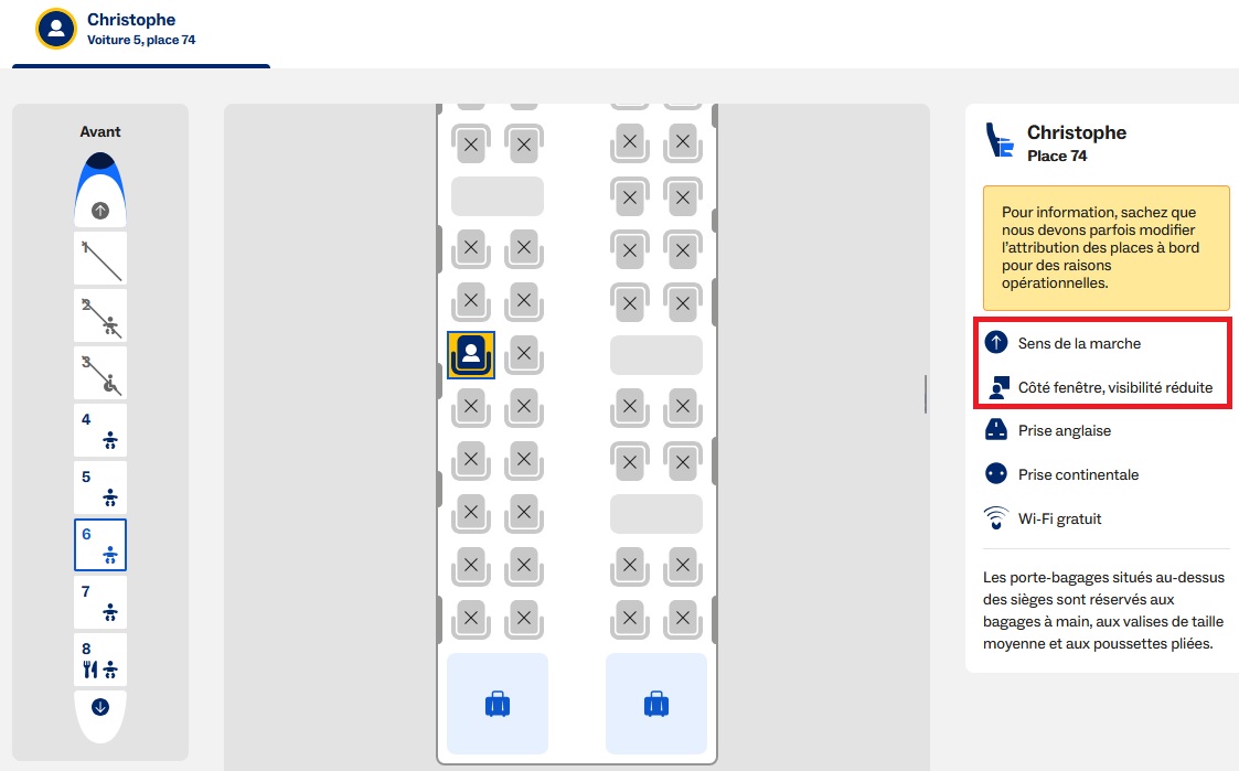 Le site internet Eurostar vous permet de sélectionner gratuitement votre siège, en vous indiquant clairement si vous êtes dans le sens de la marche et à côté d’une fenêtre (voir encadré rouge)
