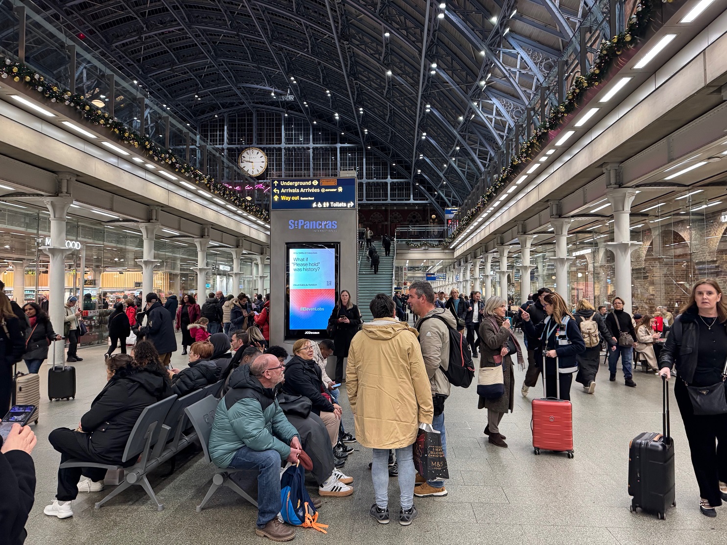 Cette fois, il est conseillé d’arriver à la Gare de St Pancras 1h15 avant l’heure de départ de votre Eurostar (au lieu de 1h avant, en Gare du Nord). Même principe qu’à Paris : du personnel d’Eurostar se tient avec des panneaux circulaires indiquant l’horaire du train pour lequel la file est ouverte. Il n’est pas utile de venir plus tôt : vous ne pourrez pas encore passer les contrôles.
