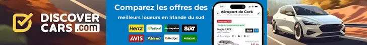 Pour réserver votre voiture de location à l’aéroport de Cork au meilleur prix, je vous conseille d’utiliser le site internet de Discover Cars : c’est un comparateur qui vous permet de comparer facilement les offres (tarifs, cautions, assurances…) des différents loueurs sur le marché.