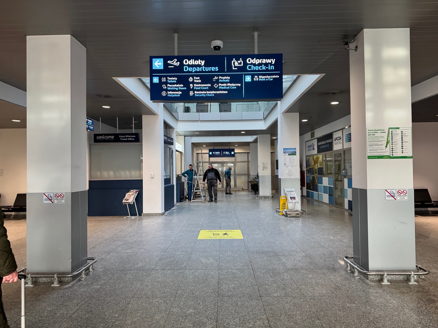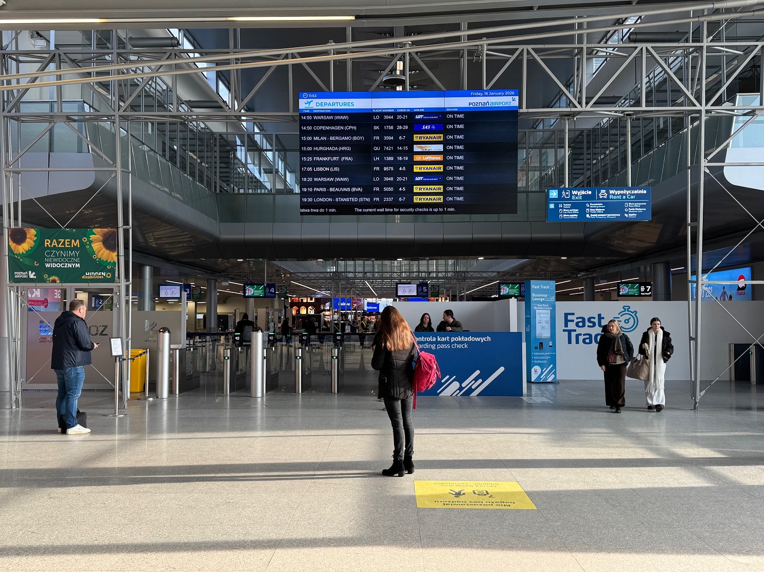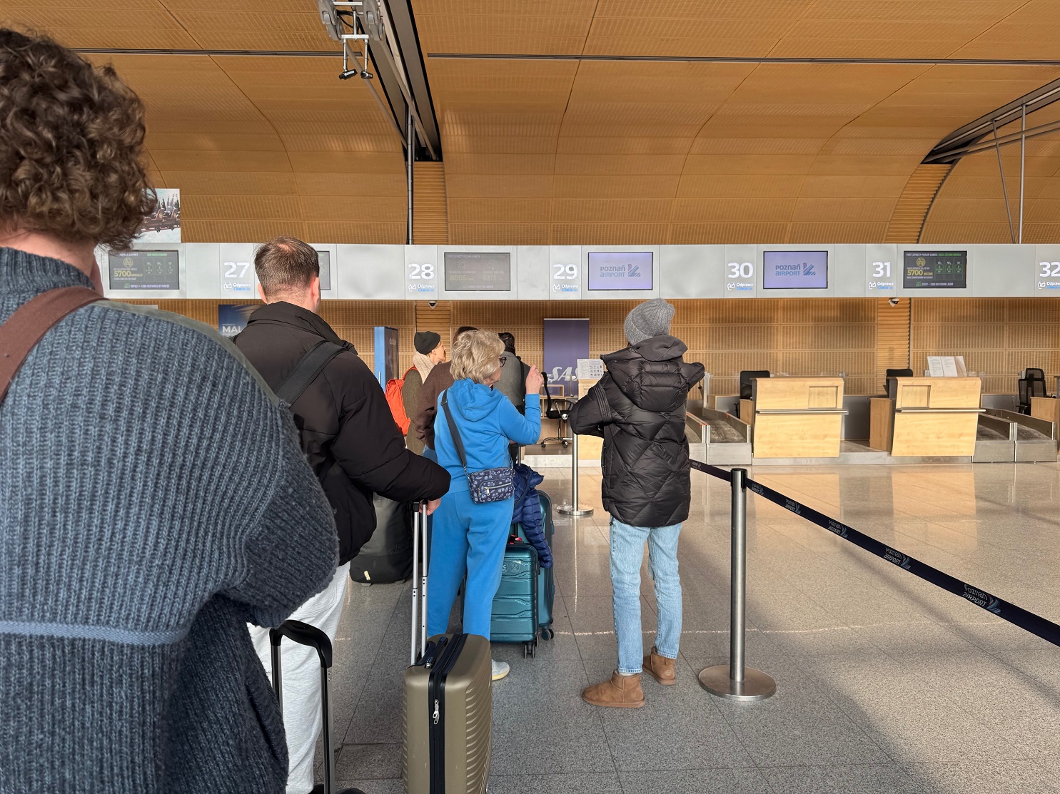 J’arrive à l’aéroport de Poznan vers 11h50, soit 3h avant le départ de mon vol. Je suis un peu en avance ! Si la première impression en entrant dans le terminal n’est pas folichonne (on arrive dans un petit couloir bas de plafond, sombre, et à moitié en travaux), le cheminement mène finalement aux comptoirs d’enregistrement, un espace plus dégagé et agréable.