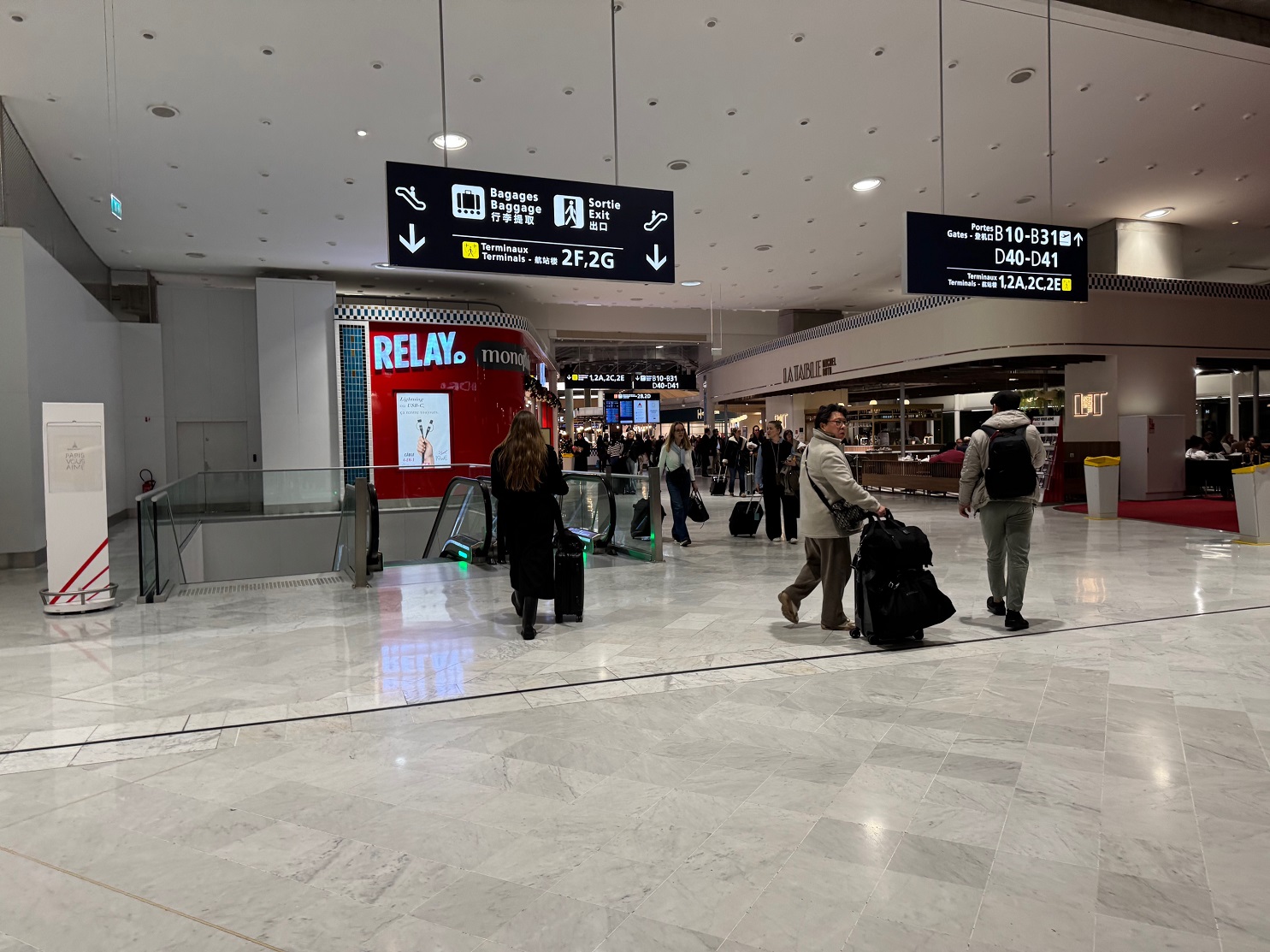 Depuis le terminal 2B, il reste néanmoins possible de rejoindre les autres terminaux de l’aéroport sans avoir besoin de repasser les contrôles de sûreté (en suivant les circuits de correspondance, matérialisés par des panneaux jaunes). Mais me concernant, c’est vers la sortie que je me dirige !