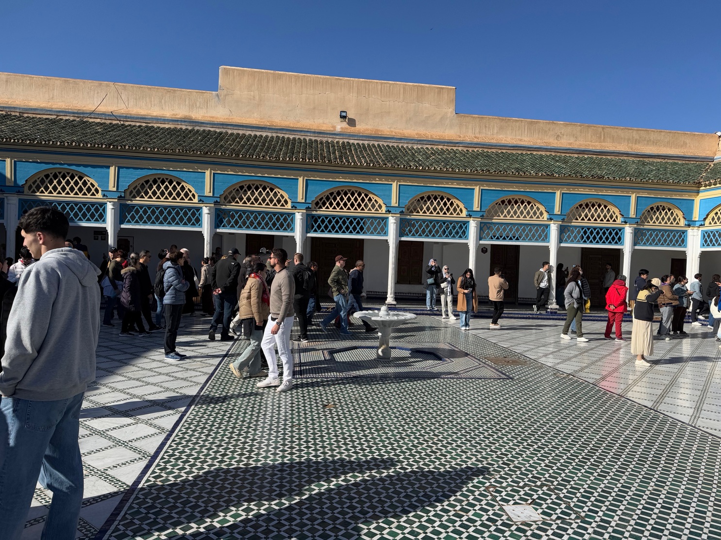 Petit à petit, le calme se fait : c’est d’ailleurs bien le rôle de ces premières cours du palais ! Elles servaient autrefois de transition, à la fois fonctionnelles et symboliques. Elles accueillaient visiteurs et serviteurs avant que ces derniers ne soient orientés vers les espaces qui leur étaient destinés. Le sol s’orne progressivement de zelliges géométriques, de plus en plus admirables.
