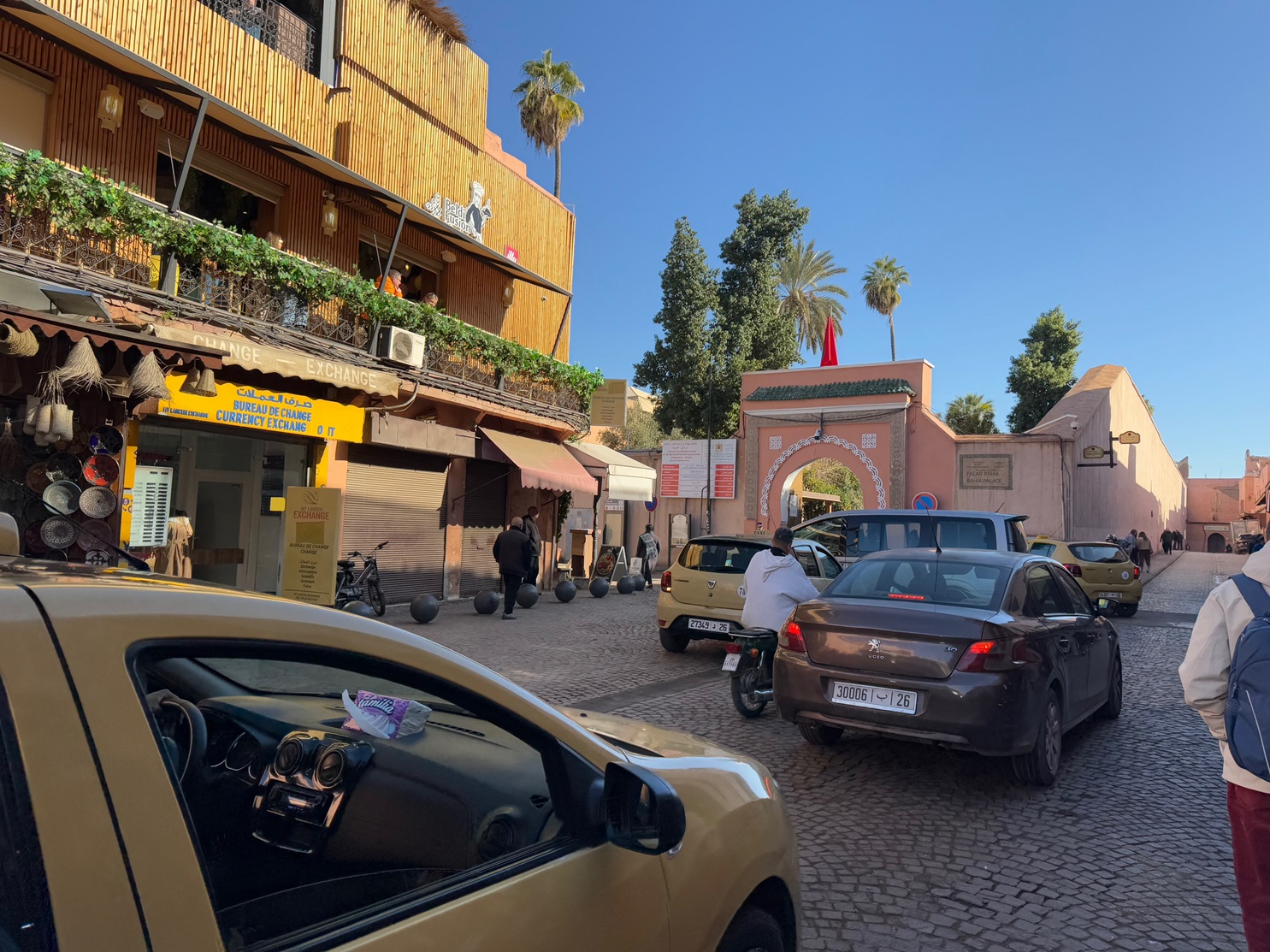 La visite du palais de la Bahia débute près de la place des Ferblantiers, dans les rues animées de la médina de Marrakech. On se laisse guider par le flot de touristes, sans doute en provenance des abords de la place Jemaa el Fna de Marrakech, qui laisse à deviner que l’une des attractions incontournables de Marrakech se situe à proximité. Les mobylettes klaxonnent, les taxis sont nombreux et mal garés… Derrière cette curieuse agitation, on pourrait presque passer à côté de la discrète porte d’entrée du Palais de la Bahia !