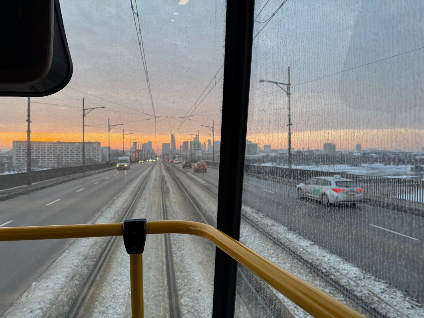 La vue depuis l’arrière d’un tramway, en traversant la Vistule en direction du quartier de Praga, sur la rive droite
